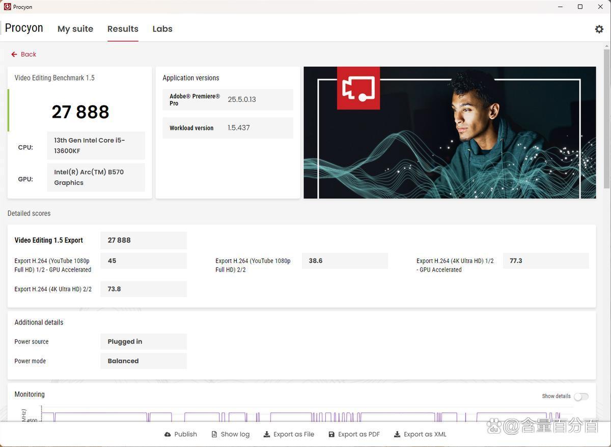主机在Procyon视频编辑(Video Editing 1.5)下的得分为27888,其中Export H.264 (YouTube 1080p Full HD) 1/2-GPU Accelerated下的得分为45,在Export H.264 (YouTube 1080p Full HD) 2/2下的得分为38.6;在Export H.264 (4K Ultra HD) 1/2·GPU Accelerated下的得分为77.3,Export H.264(4KUltra HD) 2/2下的得分为73.8。