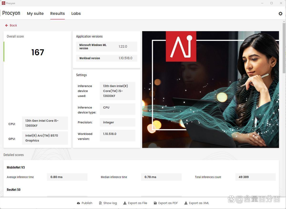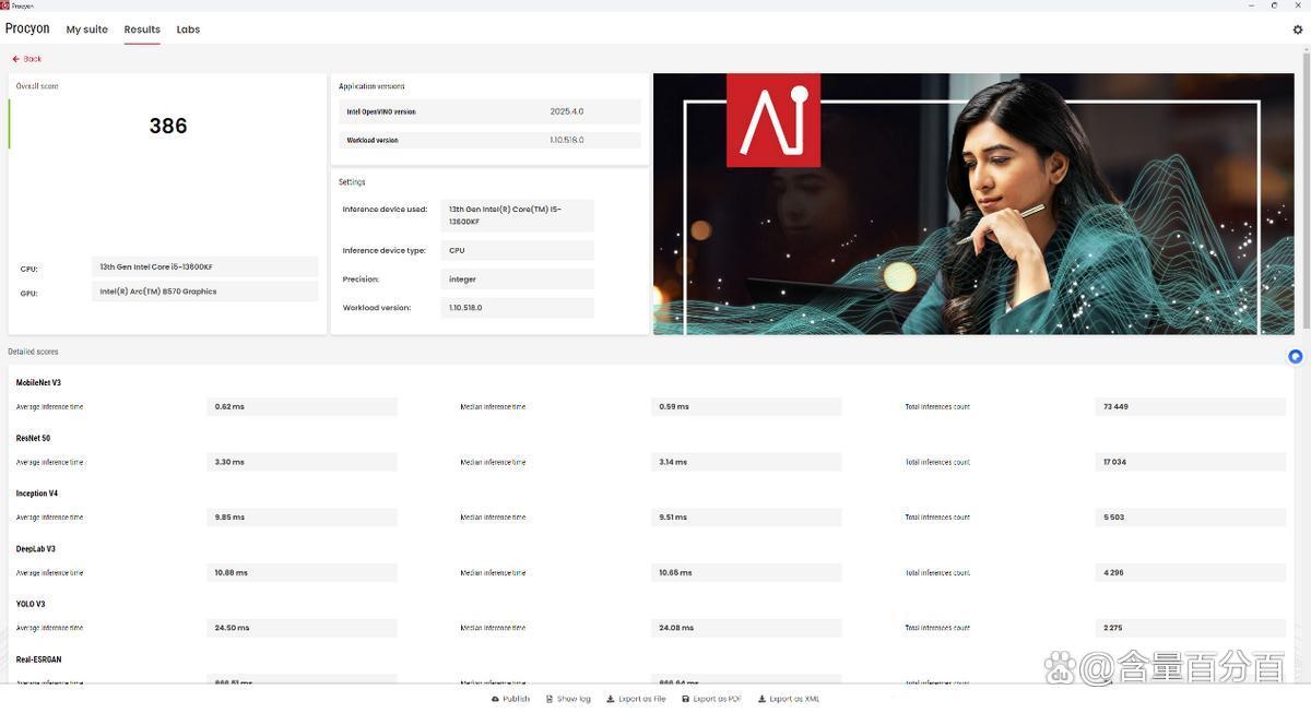 主机搭配UL Procyon Al Computer Vision Benchmark下的Microsoft Windows ML和Intel OpenVINO进行测试,主机在Intel OpenVINO/CPU integer下的测试结果为386。