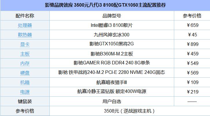 废话不多说,下面是3500元八代i3 8100配GTX1050主流配置推荐单,如下表所示。