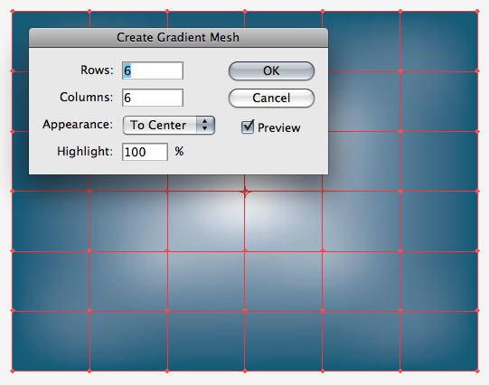 按照下面面板中的设置进行操作,绘制一个平方米相同宽度的方框 ,并填入用中色蓝(从你刚刚建立的色板中取色)。转到对象> 创建渐变网格,然后输入6行和第6栏。