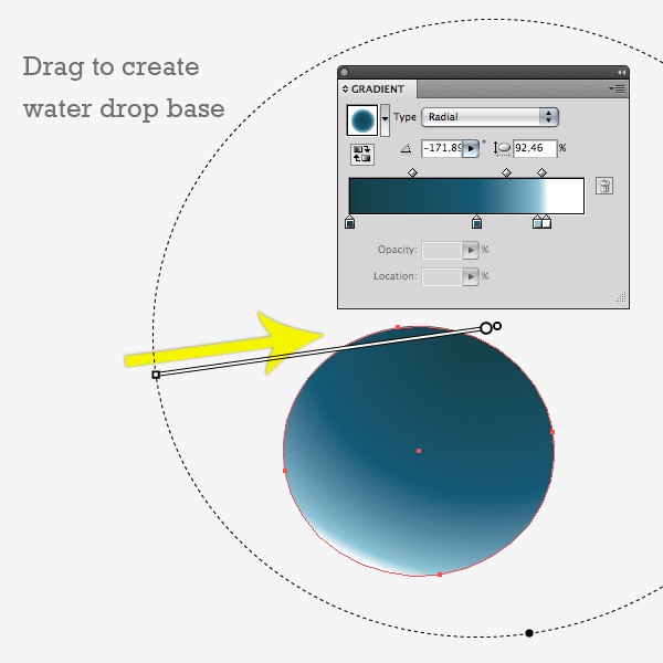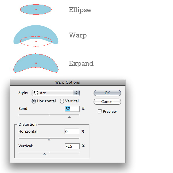 画一个长的,有些薄的椭圆形,并用最轻的蓝(蓝色# 1 )填充 。转到效果>封套>Arc,并输入下面的值。这将是突出的雨滴。用您刚刚创建的渐变填充这个扭曲了的椭圆。