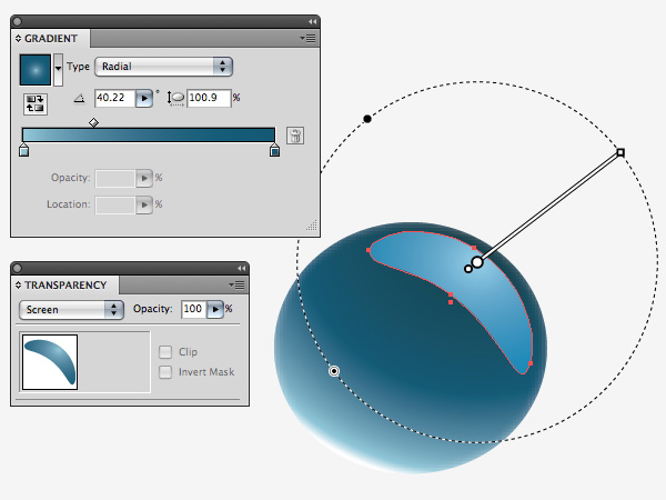 用较深的蓝色渐变填充这个形状 (Blue 8 到 Blue 6), 然后在透明度面板中,把渲染模式改为柔光. 调整渐变,使其更为真实。