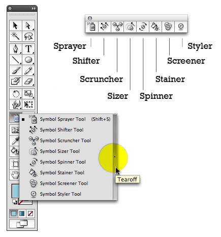 好了,让我们利用图案喷枪工具来制作雨滴.点击浮动工具栏上面的图案喷枪工具 (Shift + S). 按住这个图标,显示出横向的面板.这个面板将更方便的应用盆腔工具.