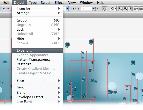 你可以复制单个图案,作为一个群组重新定义它们的尺寸。目的只有一个,就是让水滴更加真实.利用对象>扩展,大三我们刚刚制作的图案.