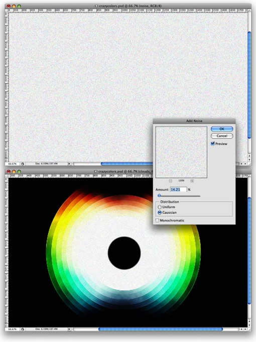首先,新建一层,用椭圆选框工具(M)来画一个小圆。把它填充为黑色,使它和彩圆那层居中对齐。然后再创建一个新层,此时确保前景色和背景色为黑色和白色,使用滤镜 > 渲染 > 云彩,并把图层混合模式设为“叠加”。