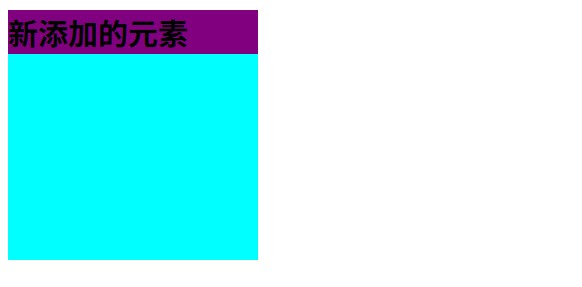 var obj = document.querySelector(".aa") var bb = document.querySelector(".bb") var newNode = document.createElement("h2") console.log(newNode) newNode.innerText = "新添加的元素" newNode.className = "xixi" newNode.style.background = "purple" obj.appendChild(newNode,bb)