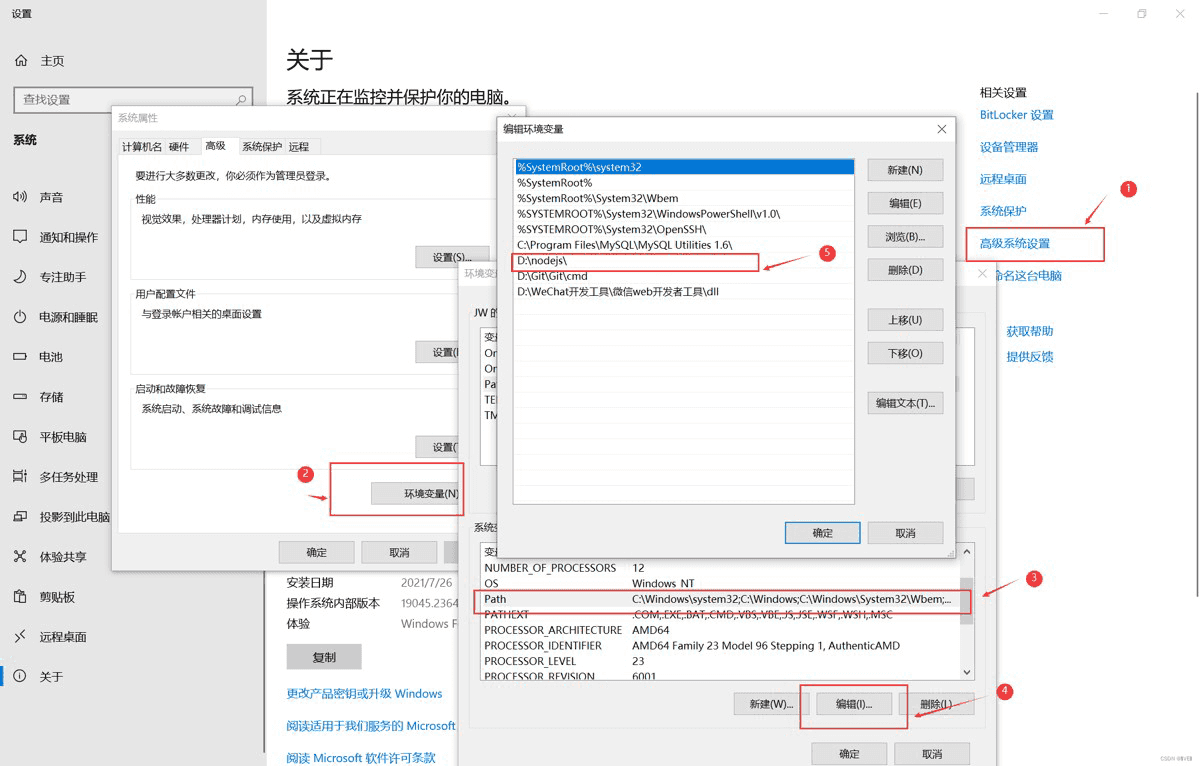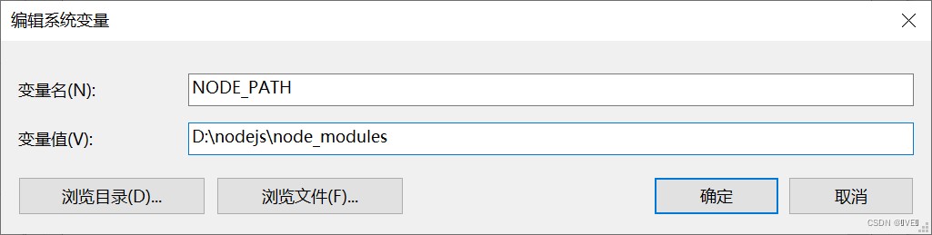 - 执行成功后,然后再此电脑 -> 右键属性 -> 高级系统设置 -> 环境变量 -> 系统变量中新建一个变量名为 “NODE_PATH”, 值为“D:\nodejs\node_modules”,如下图: