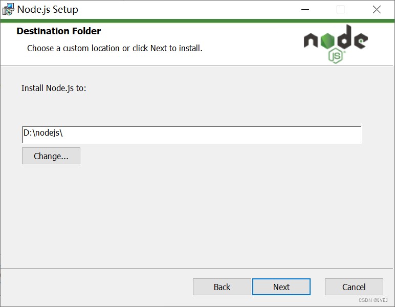 - 选择安装位置,我这里装在D盘下新建的nodejs文件夹下: