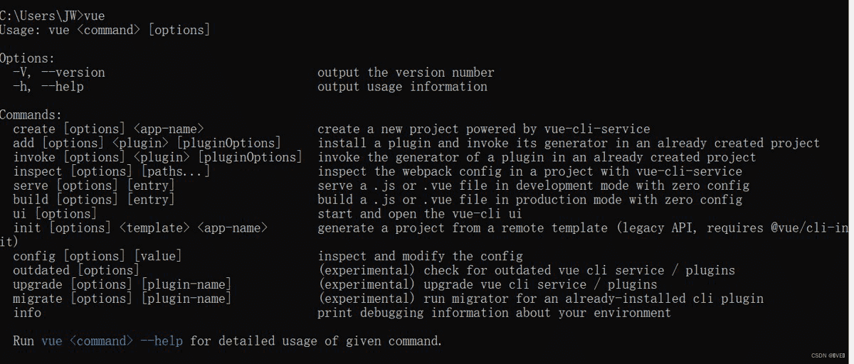 -- 安装完成之后重启,输入vue,如下图说明安装成功。