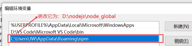 - 最后编辑用户变量里的Path,将其中默认的C:\Users\用户名\AppData\Roaming\npm更改为D:\nodejs\node_global下图: