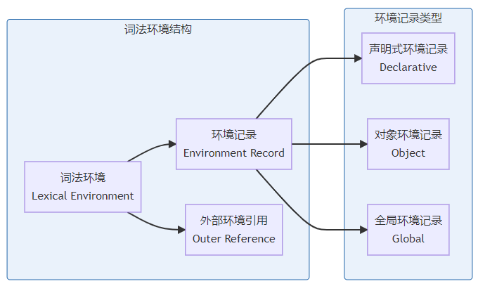 词法环境是存储标识符-变量映射的结构,由环境记录和外部环境引用组成。