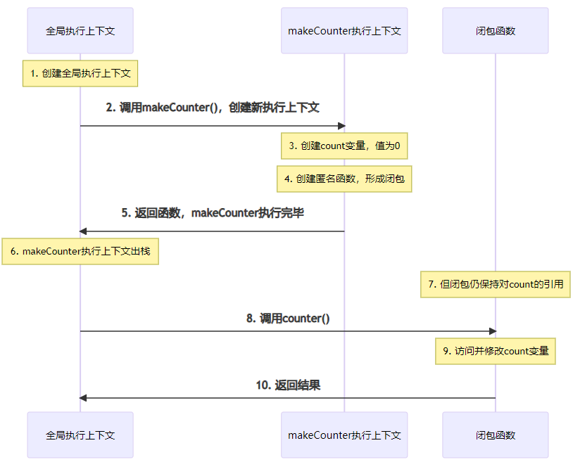 // 步骤 1-2: 全局执行上下文创建,调用makeCounter function makeCounter() { // 步骤 3: 在makeCounter的词法环境中创建count变量 let count = 0; // 步骤 4: 创建匿名函数,该函数的[[Environment]]属性 // 指向makeCounter的词法环境,形成闭包 return function() { // 步骤 9: 通过作用域链找到外部的count变量 count++; return count; }; // 步骤 5-6: makeCounter执行完毕,执行上下文出栈 // 但count变量因为被闭包引用而不会被垃圾回收 } // 步骤 7: counter变量保存了闭包函数的引用 const counter = makeCounter(); // 步骤 8-10: 每次调用counter()都会访问保存的count变量 console.log(counter()); // 1