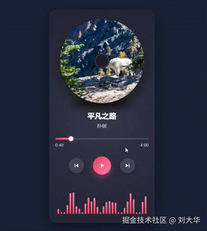 <div class="music-player"> <!-- 专辑区域 --> <div class="album-container"> <!-- 专辑封面和底座 --> </div> <!-- 歌曲信息 --> <div class="song-info"> <!-- 歌曲标题和艺术家 --> </div> <!-- 进度条 --> <div class="progress-container"> <!-- 可交互进度条和时间显示 --> </div> <!-- 控制按钮 --> <div class="controls"> <!-- 播放/暂停、上一曲、下一曲按钮 --> </div> <!-- 音频可视化 --> <div class="visualizer"> <!-- 动态音频条 --> </div> </div>