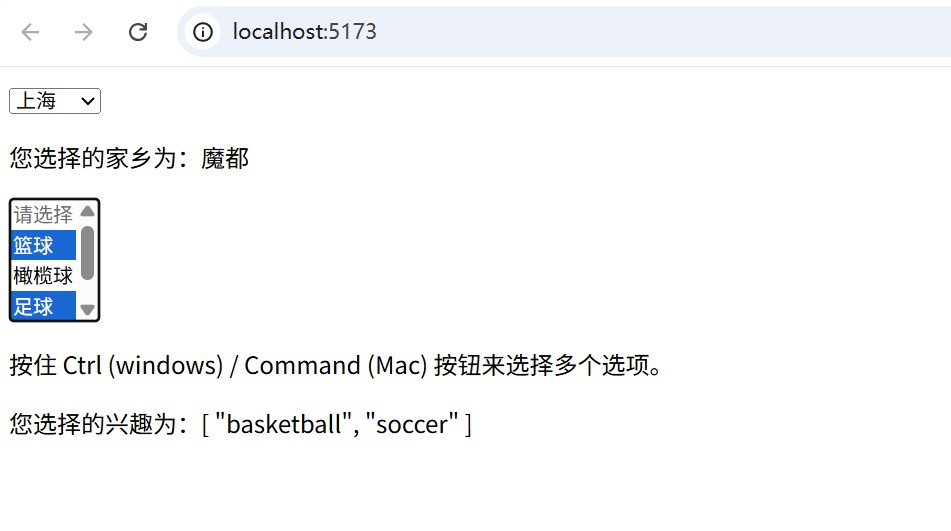 <template> <!-- 下拉列表列表是单选的话,v-model 绑定的值是一个字符串,这个字符串是 option 的 value 值 --> <select v-model="hometown1"> <option value="" disabled>请选择</option> <option v-for="(item, index) in hometownList" :key="index" :value="item.value"> {{ item.label }} </option> </select> <p>您选择的家乡为:{{ hometown1 }}</p> <!-- 如果下拉列表是多选的话,v-model 绑定的值是一个数组,这个数组是 option 的 value 值组成的数组 --> <select v-model="hobbies" multiple> <option label="" disabled>请选择</option> <option v-for="(item, index) in hobbyList" :key="index" :value="item.value"> {{ item.label }} </option> </select> <p>按住 Ctrl (windows) / Command (Mac) 按钮来选择多个选项。</p> <p>您选择的兴趣为:{{ hobbies }}</p> </template> <script setup> import { ref } from 'vue' const hometown1 = ref('') const hobbies = ref([]) const hometownList = ref([ { value: '成都', label: '四川' }, { value: '帝都', label: '北京' }, { value: '魔都', label: '上海' }, { value: '妖都', label: '广州' }, { value: '陪都', label: '重庆' } ]) const hobbyList = ref([ { value: 'basketball', label: '篮球' }, { value: 'football', label: '橄榄球' }, { value: 'soccer', label: '足球' }, { value: 'baseball', label: '排球' }, ]) </script> <style scoped></style>