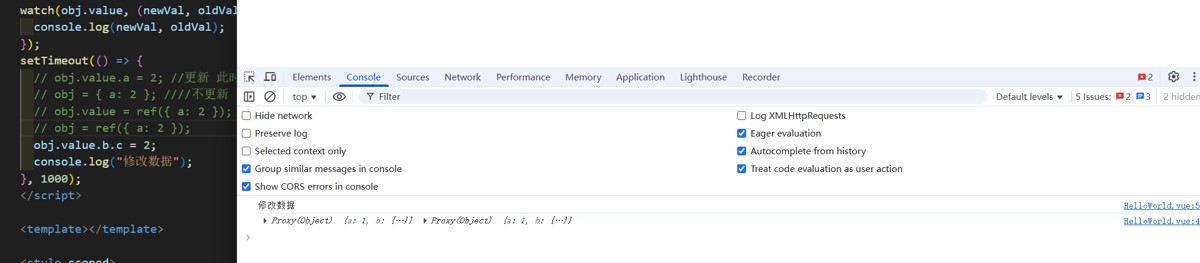 修改obj.b.c = 2 呢,会重新触发,因为watch监听reactive默认deep:true,默认进行深度监听
