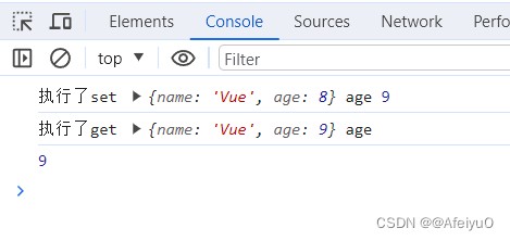 1:obj2.age = 9; //修改值 触发执行了set 就会执行set里面的console.log newVal=9 但是实际return是8没有改到