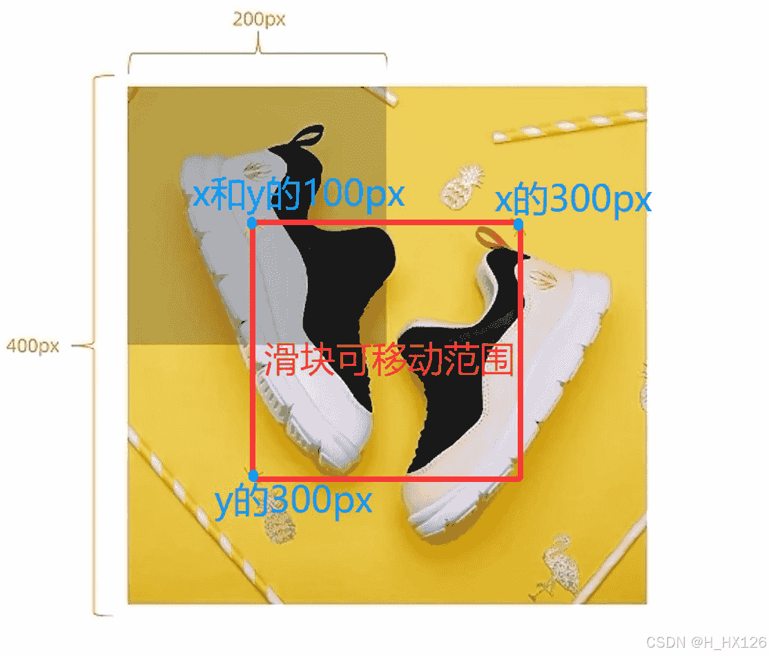 - 鼠标移动到 x 的 300px 或者 y 的 300px 位置时,蒙版滑块也会超出目标盒子,需要把滑块的 left 和 top 值固定为最大值 200,避免滑块继续移动超出目标盒子