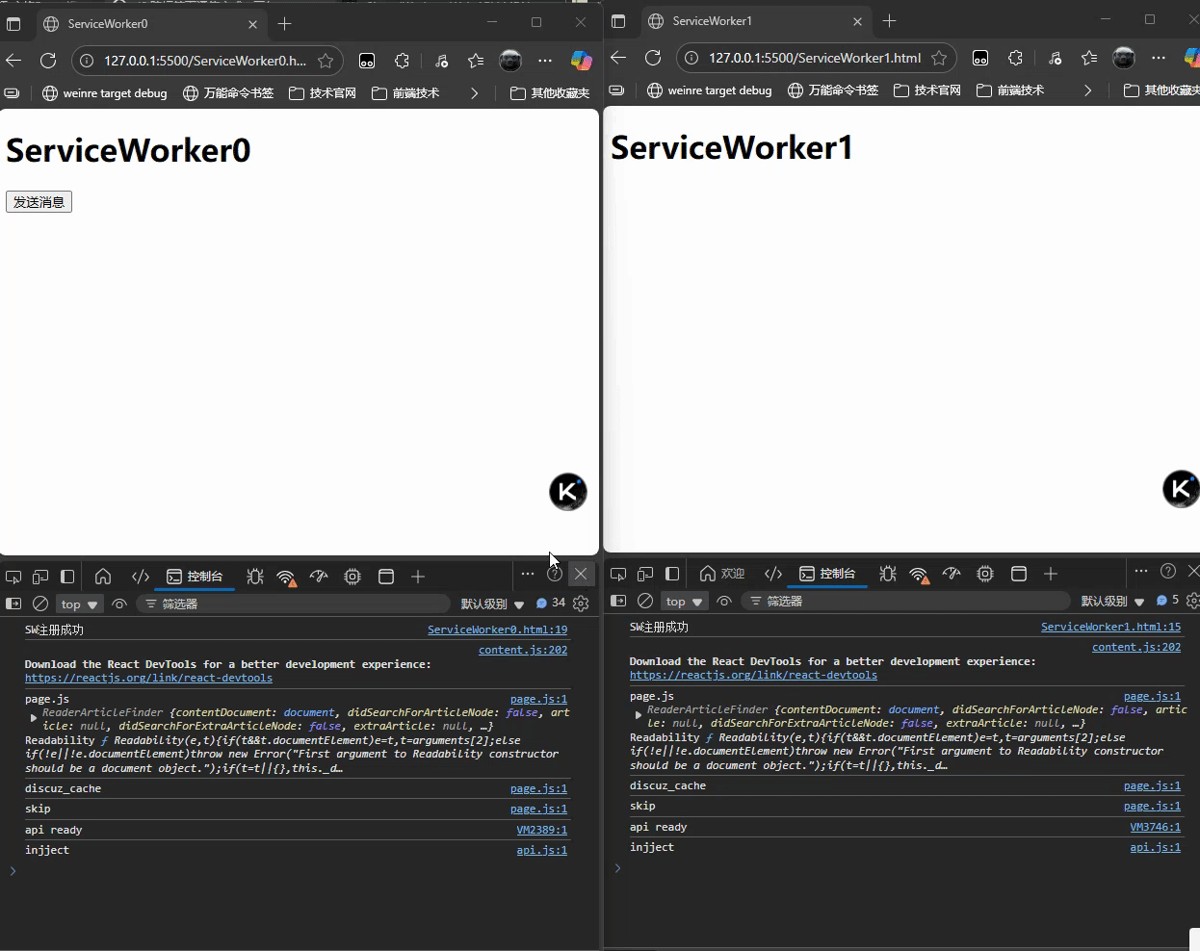 面试官有提到Service Worker也可以,我面试完后的查询资料尝试了这些方法,都挺顺利的,就是Service Worker折腾了一会才跑通,使用起来相比前面的一些方式,它稍微复杂一些,我觉得用于消息通信只是它的冰山一角,它有一个主要功能就是用来解决一些耗性能的计算密集任务