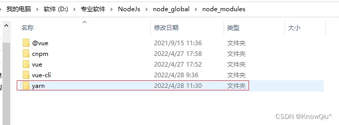 # 全局安装目录 yarn config set global-folder D:\专业软件\NodeJs\node_global\node_modules\yarn\yarn_global # 缓存目录 yarn config set cache-folder D:\专业软件\NodeJs\node_global\node_modules\yarn\yarn_cache