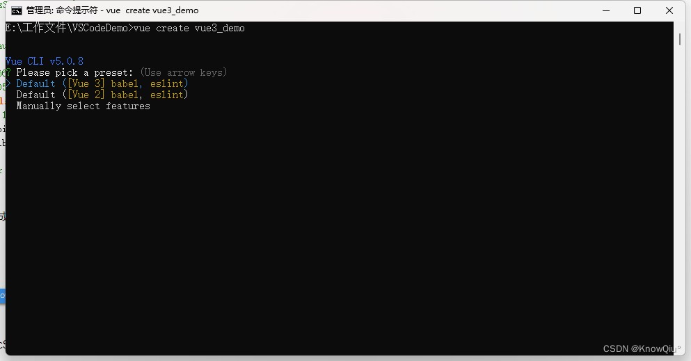 1、打开控制台,切换至项目文件夹,输入项目创建命令 :vue create vue3_demo