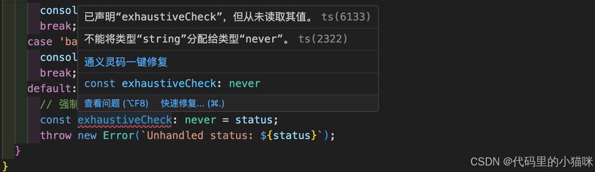 在 switch 语句的 default 分支中,我们定义了一个 exhaustiveCheck 变量,类型为 never,并将 status 赋值给它。TypeScript 会在编译时检查,如果 status 不是 never 类型(即还存在未处理的情况),会触发编译错误。