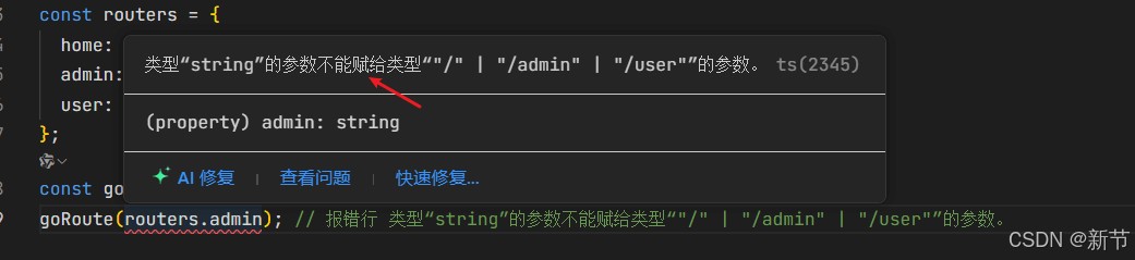 goRoute(routers.admin); // 报错行: 类型"string"的参数不能赋给类型'"/" | "/admin" | "/user"'的参数。