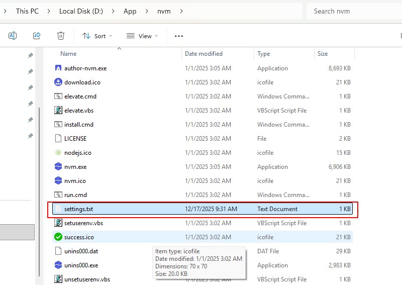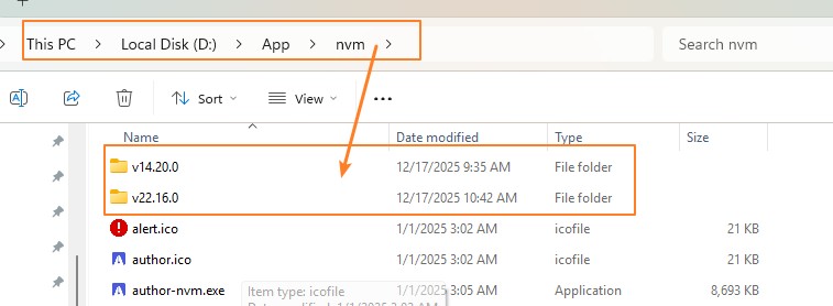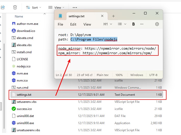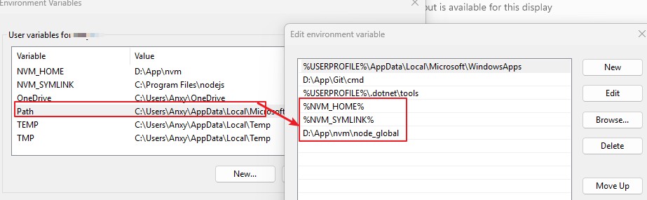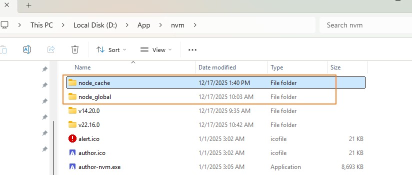npm config set prefix "D:\App\nvm\node_global" npm config set cache "D:\App\nvm\\node_cache"