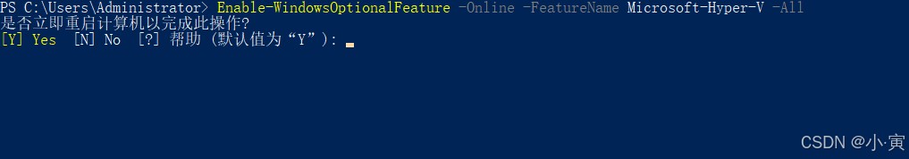 输入命令:Enable-WindowsOptionalFeature -Online -FeatureName Microsoft-Hyper-V -All