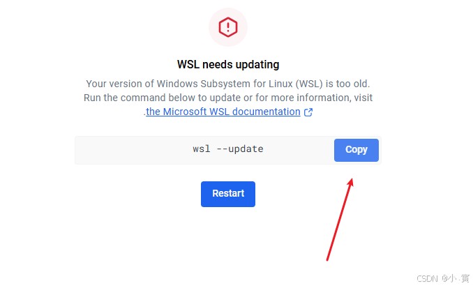 注意 : 这里有个问题需要注意,如果打开docker工具后,如果出现linux版本太旧了则会有提示命令,那么直接复制到cmd更新,如下几图