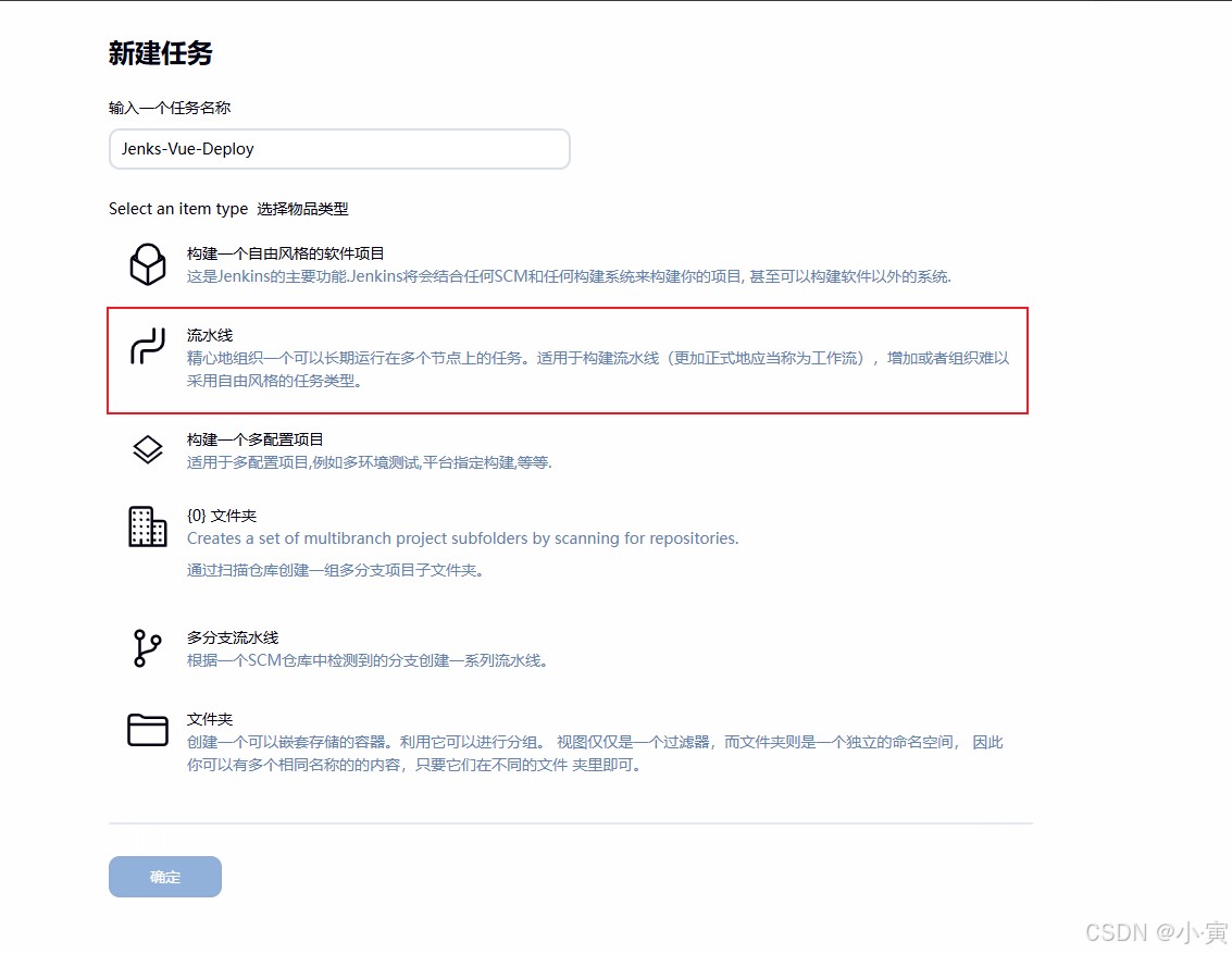 输入任务名称,选择Pipeline流水线点击确定。