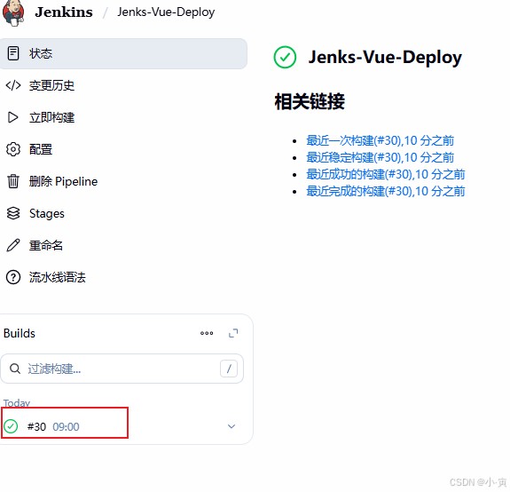 }第九步:最终点击保存,最终测试构建,保存后会进入详情页,点击左侧的立即构建,触发第一次手动构建,点击后,下方会出现构建历史如#30,第一次构建就是#1