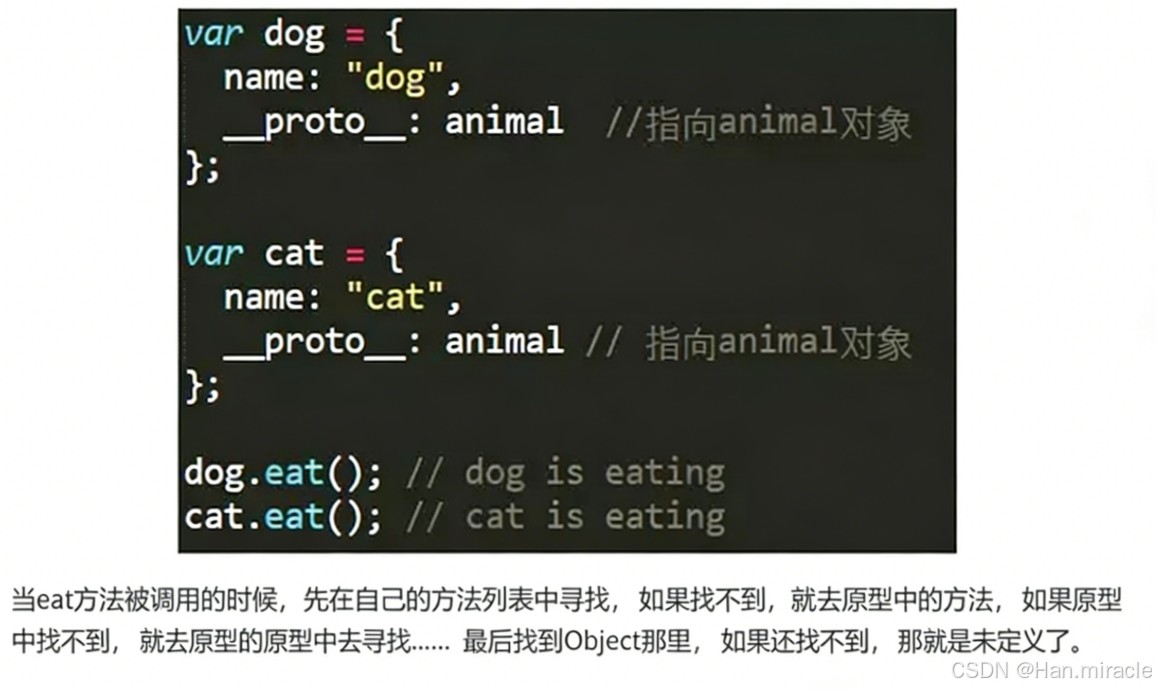 例如:创建一个 cat 对象和 dog 对象,让这两个对象都能使用 animal 对象中的 eat 方法。通过 __proto__ 属性来建立这种关联关系(proto 翻译作 “原型”)