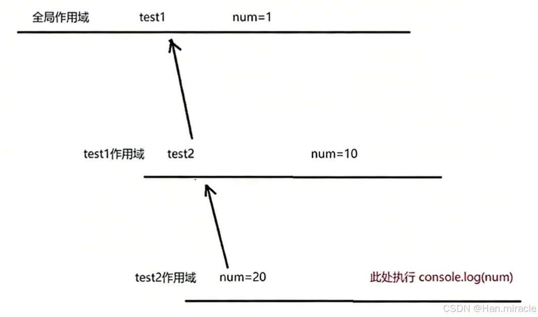 20执行 console.log(num) 的时候,会现在 test2 的局部作用域中查找 num,如果没找到,则继续去 test1 中查找,如果还没找到,就去全局作用域查找。