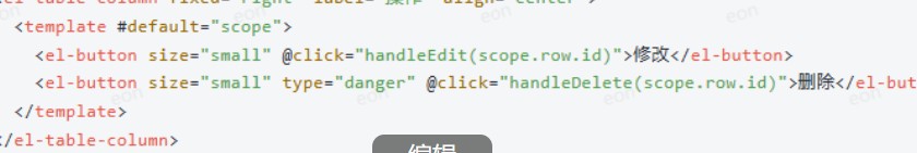 在prop中要展示所有的内容 label定义表头名称,最后这个操作的字段要定义两个按钮这里要用到自定义列模板然后定义两个按钮编辑和删除