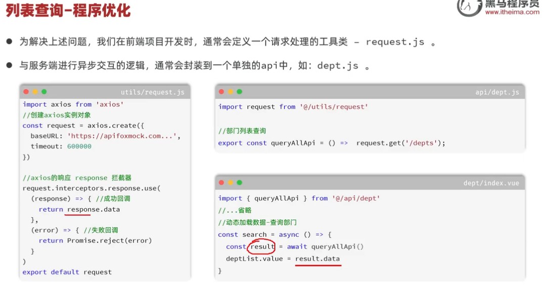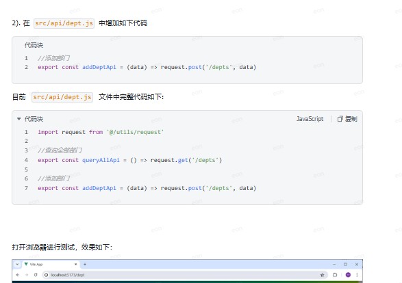 与服务端进行异步交互的逻辑时,通常会封装到一个单独的APi当中如dept.js然后在这个类当中先要引入上面那个工具类然后在这个类中定义一个方法用来查询然后这个url直接写后面这个部分前面那个部分已经在上各类
