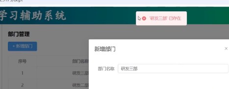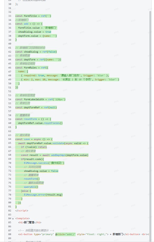 新增部门添加我们是用到了前端的对话框首先那点击这个按钮会弹出对话框然后去官网找到对应的组件还有要把他的数据模型声明一下然后同时默认值给他设置一个false要把它隐藏起来, 然后整个表达的数据要绑定在dept当中然后将表单相的名字改为部门名称,然后再修改一下宽度