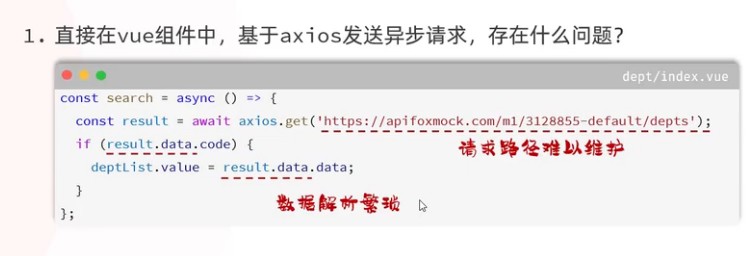 我们原来写的这个异步请求,我们会发现两个问题,第一个是请求路径难以维护,第二个是数据解析过于繁琐