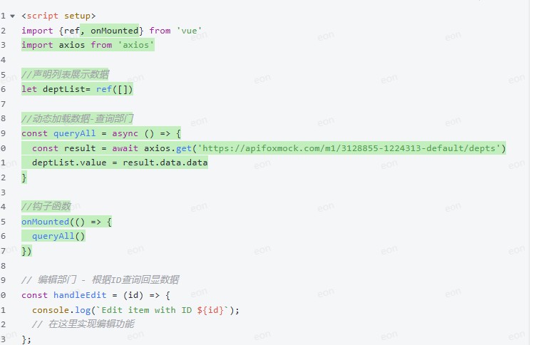 需要在 src/views/dept/index.vue 中增加如下代码,在页面加载完成发送异步请求(https://apifoxmock.com/m1/3128855-1224313-default/depts),动态加载的Axios。