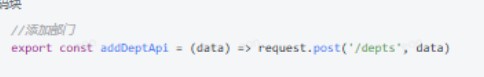 这里我们再加上与后端交互的逻辑在dept这个类当中定义一个新增函数用来与后端交互,同时呢,因为我们要传递参数然后在括号中写上对应的参数名字,同时那将get改为post 然后再在后面的括号把请求参数传到了