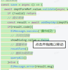 然后我们再翻回来当我们点击确定的按钮的时候调用save这个函数这个里面调用刚刚与后端交互的那个函数addapi 同时呢,我们在括号当中传入参数用点value的方式,那我们再加上await和async然后我们再进行判断成功了,还是失败了判断他返回的code值,如果成功了,我们第一步要提示信息用alert,第二部然后再关闭对话框设置成false,然后第三部调用查询函数如果失败了,我们直接输入提示信息,