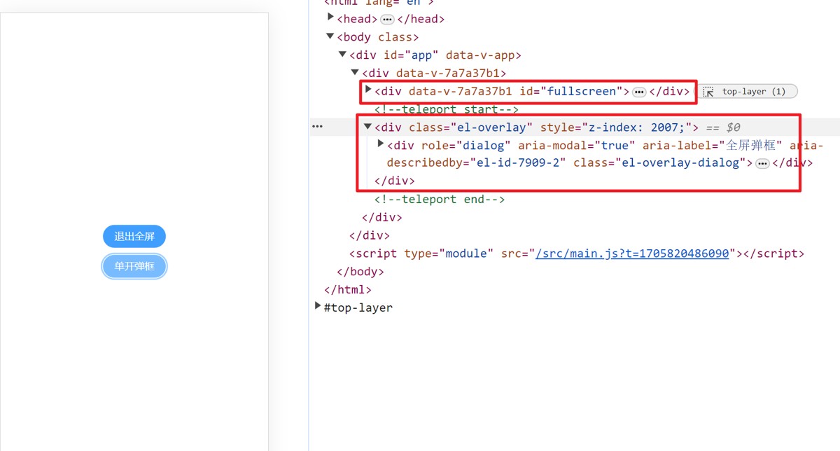 想要全屏的元素都应该在这个Element节点下面,否则的话全屏时不会展示。如下图的html结构,点击单开弹框依然无法在全屏模式下看到弹窗,推出全屏时会看到弹窗已经出现。如果想避免这种莫名的问题,可以把document.getElementById('fullscreen') 改成document.documentElement,让整个HTML全屏。