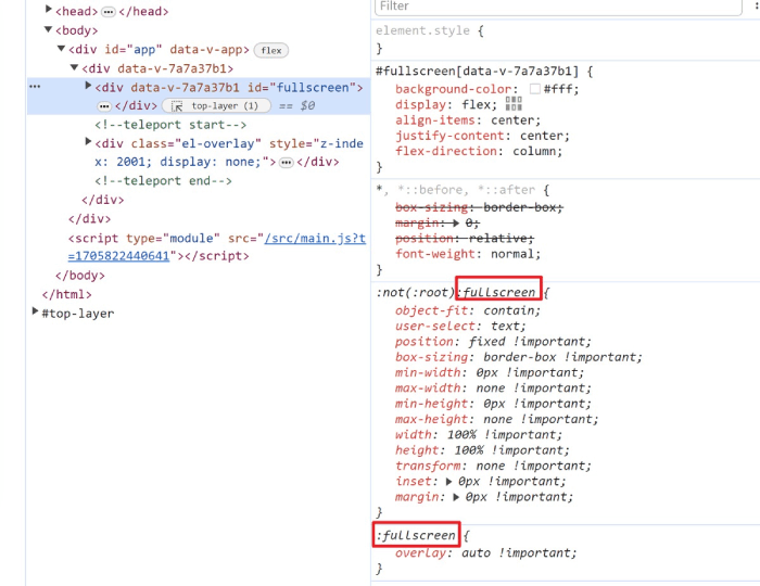 如果想改变全屏状态时的样式,首先可以在全屏时添加一个calss,此外也可以使用:full-screen伪类,大部分浏览器都支持,检查全屏时元素,也是有使用:full-screen伪类的。