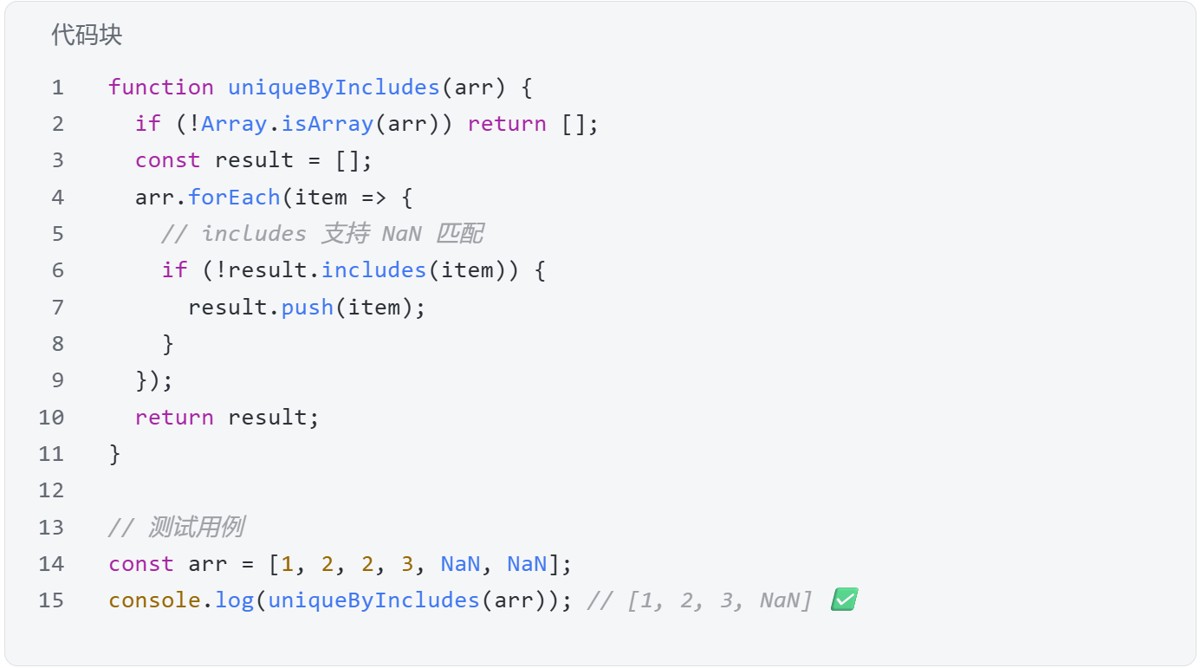 ❌ 缺点:效率低(O(n²))、兼容 ES7+(比 Set 兼容性稍差);