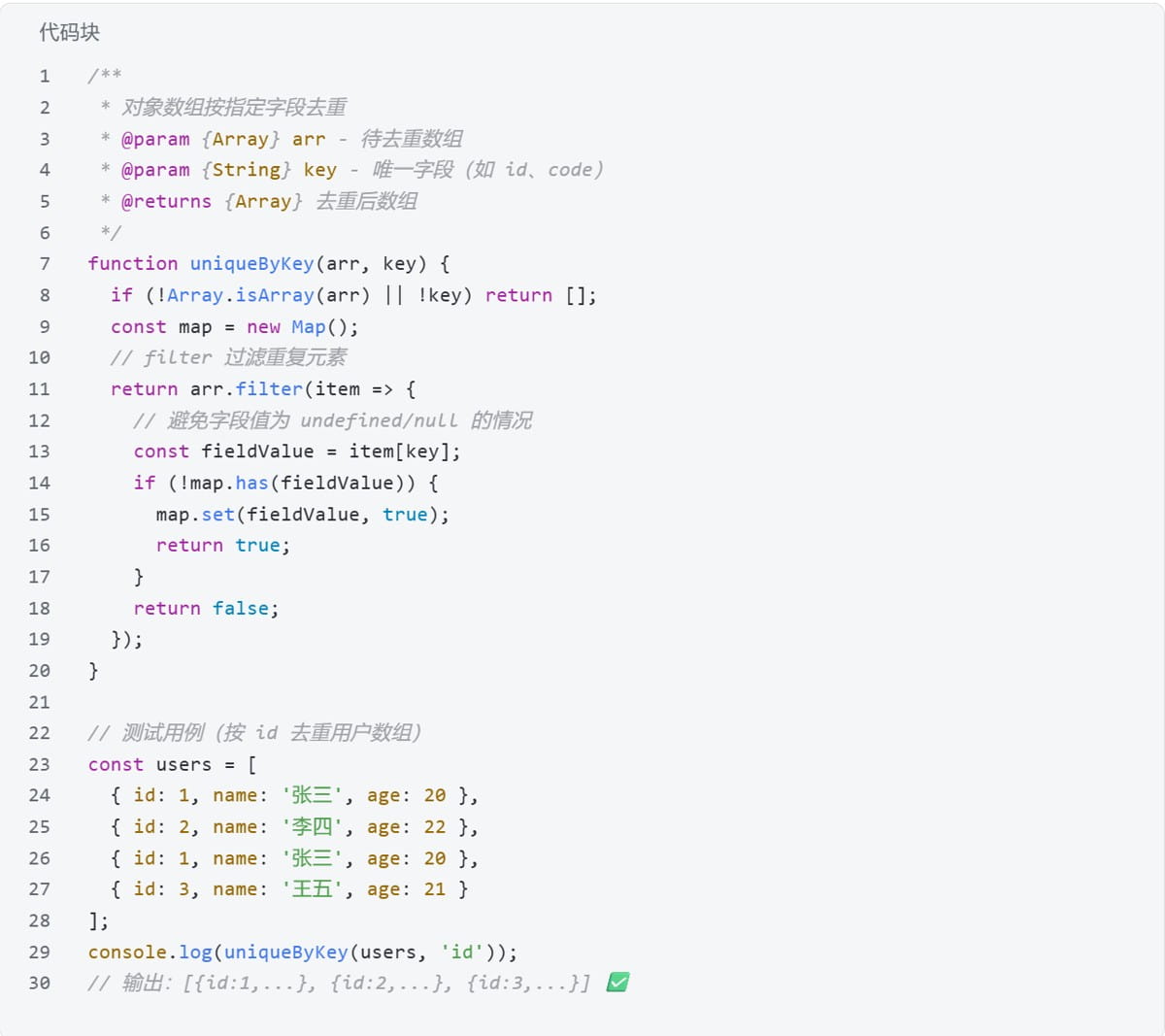 适用场景:项目开发中对象数组去重(如表格数据、接口返回列表)。