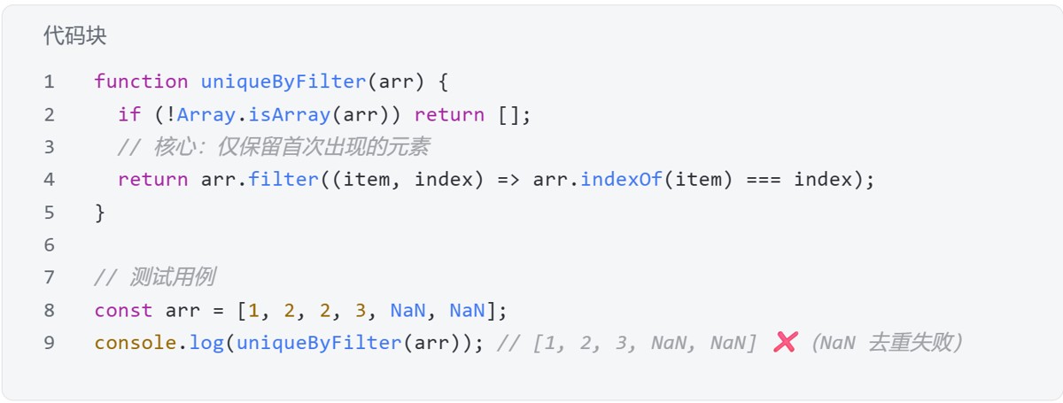 indexOf/filter+indexOf:基于 === 匹配,NaN === NaN 为 false,无法去重 NaN;