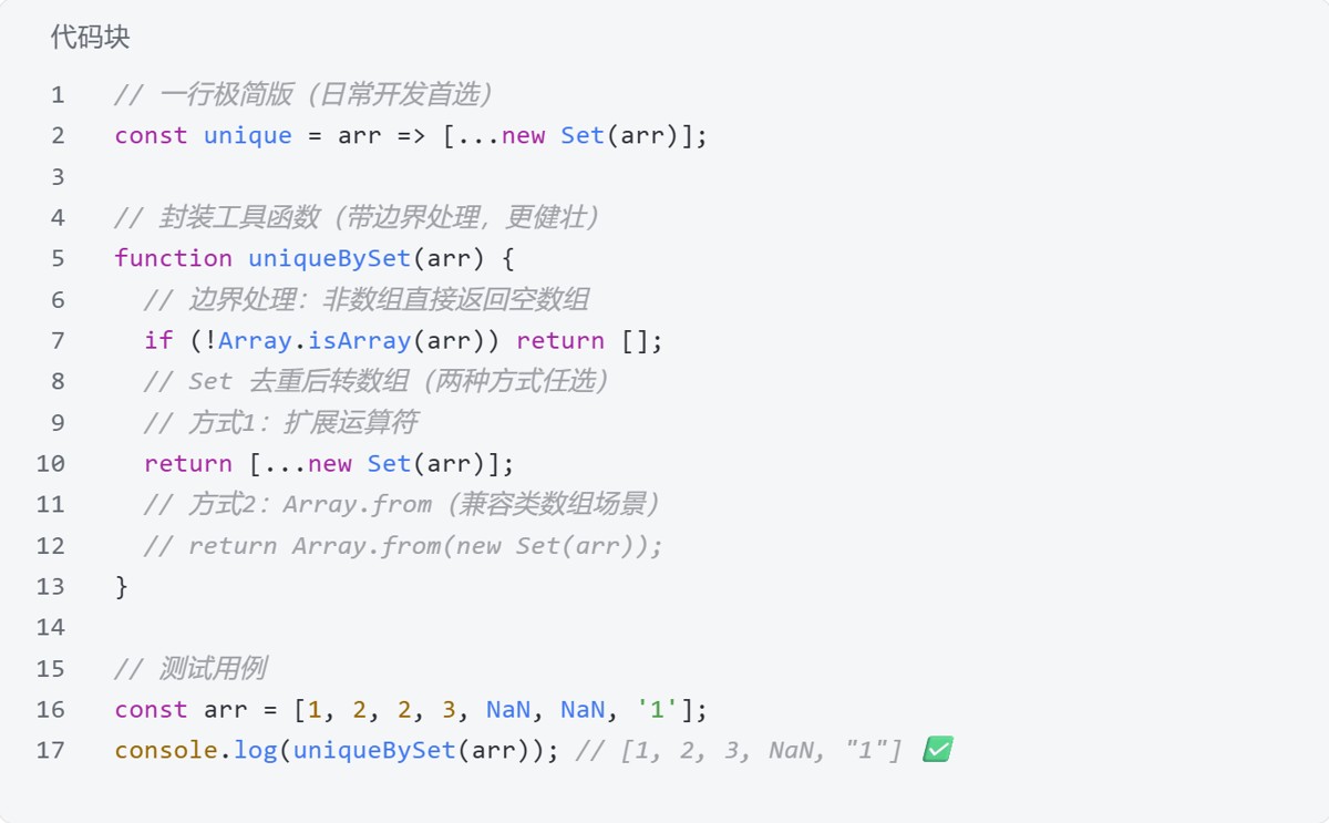 ✅ 优点:代码极简、执行效率高(时间复杂度 O(n))、支持 NaN 去重;