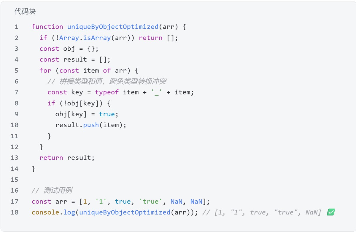 ✅ 优点:兼容旧浏览器(IE6+)、效率 O(n)、支持 NaN 去重;