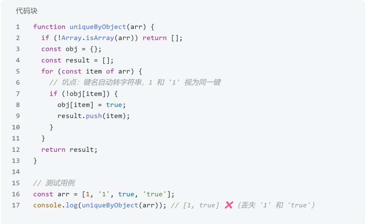 对象键值法基础版会将键名转为字符串,导致 1 和 '1'、true 和 'true' 被视为同一元素,需通过「类型+值」拼接优化。