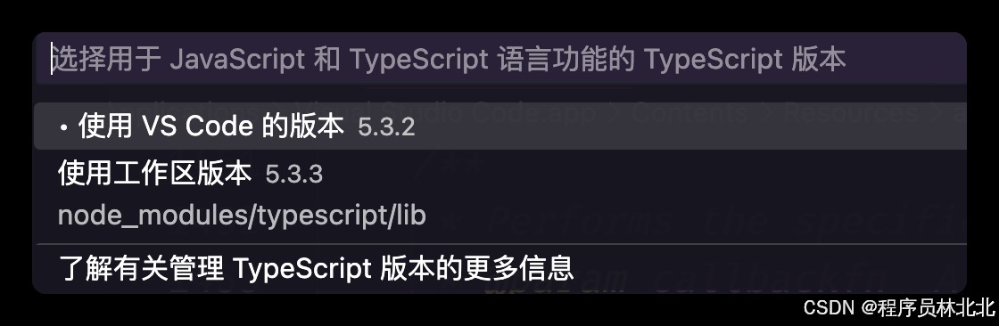 这是由于我们的VS Code等IDE工具在安装或者更新的时候,已经内置了typescript的lib。一般在你的VS Code安装路径 -> resources -> app -> extensios -> node_modules -> typescript 下