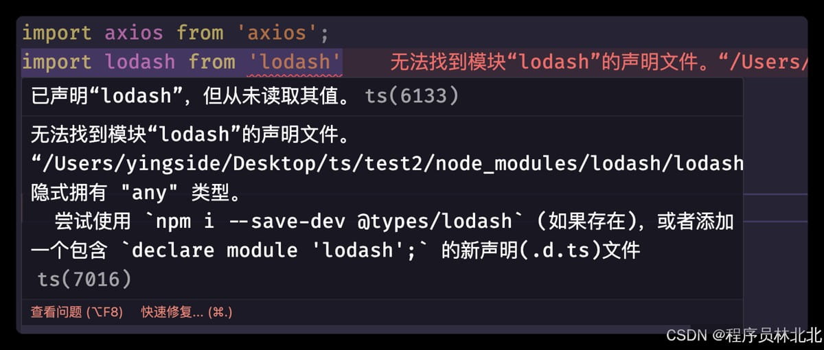 其实打开这两个库的源代码就能发现问题,axios是有 .d.ts 文件的,而lodash没有,也就是说根本没有类型声明,那当然就和提示的错误一样,无法找到模块的声明文件。